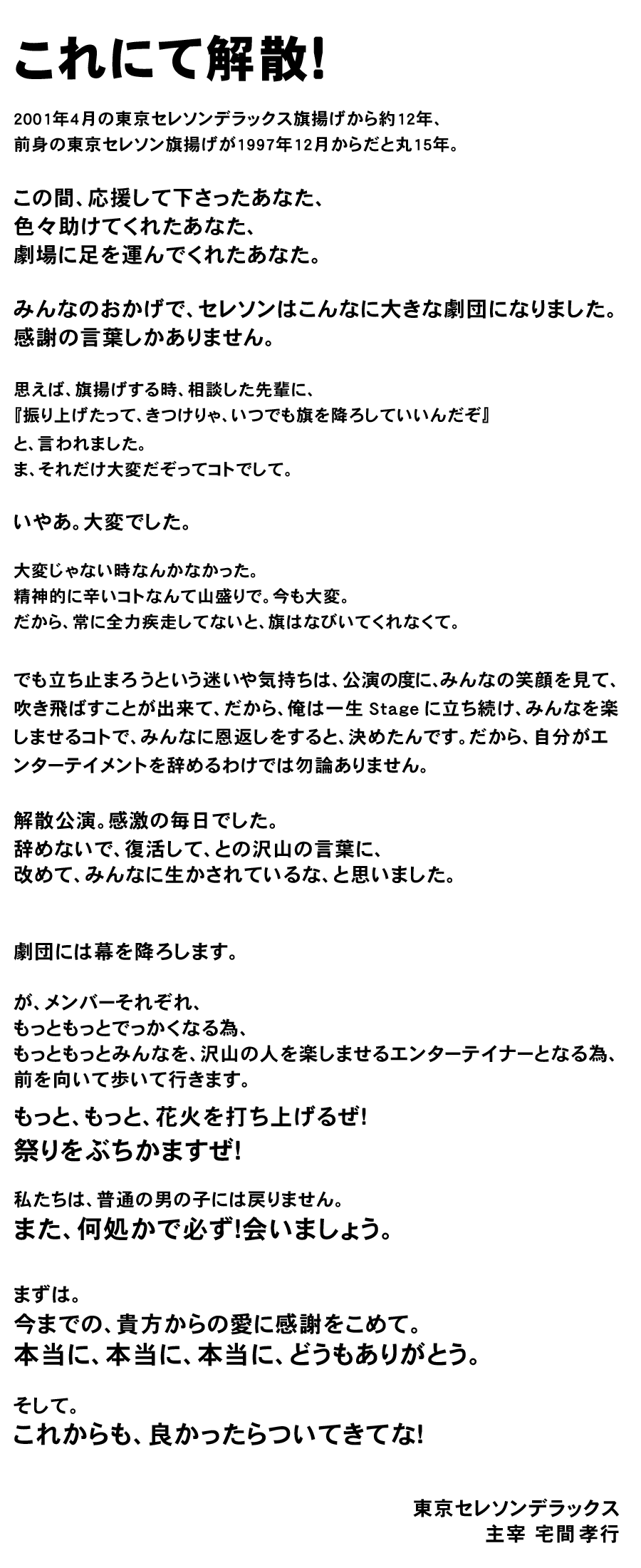 2012年12月31日、東京セレソンデラックスこれにて解散!宅間孝行からのコメント